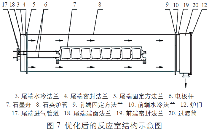 優(yōu)化后的反應(yīng)室前端結(jié)構(gòu)增加了前端密封法蘭、過渡筒、伸縮桿、內(nèi)爐門、隔熱板和導(dǎo)流管。優(yōu)化后的反應(yīng)室前端剖面示意圖如圖10 所示。